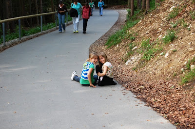 The girls had so much fun running down the hill. Right after this next turn, all the other guests pretty much disappeared. They must have known something we didn't know. We had started this castle tour at the end of the day (we had done the Linderhof earlier), so we missed the last bus, and missed the last carriage ride. Therefore we had to walk down the whole hill. We found a couple hundred stairs that was a shortcut, a much harder walk, but definitely worth taking.